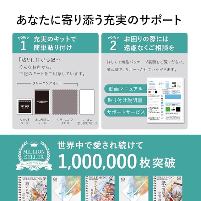 【気泡ゼロ】:特殊なシリコン吸着素材を採用。指やカードで簡単に押し出すことができます。貼り付け失敗した場合でも、はがして貼り直しが可能です。※ホコリが立ちにくい場所で拭き取りシート、クロス、ホコリ除去シールを使用し、ホコリを完全に除去してから貼り付けてください。
