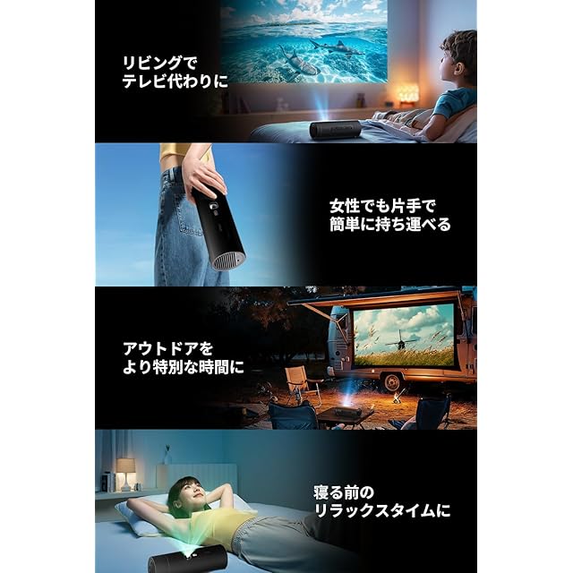 【わずか約1.3kgで気軽に使えるコンパクトさ】スタンド不要なデザインやシームレス補正という次世代技術を搭載しながら、約1.3kgという驚異的な軽さ・コンパクトさを実現。女性でも片手で軽々と持ち運ぶことができるので、普段はリビングでテレビ代わりに使いながら、キッチンで料理をしながら動画をみたり、寝室で天井に投影してお子さんを寝かしつけたりなど様々な場面でご利用いただくことができます。