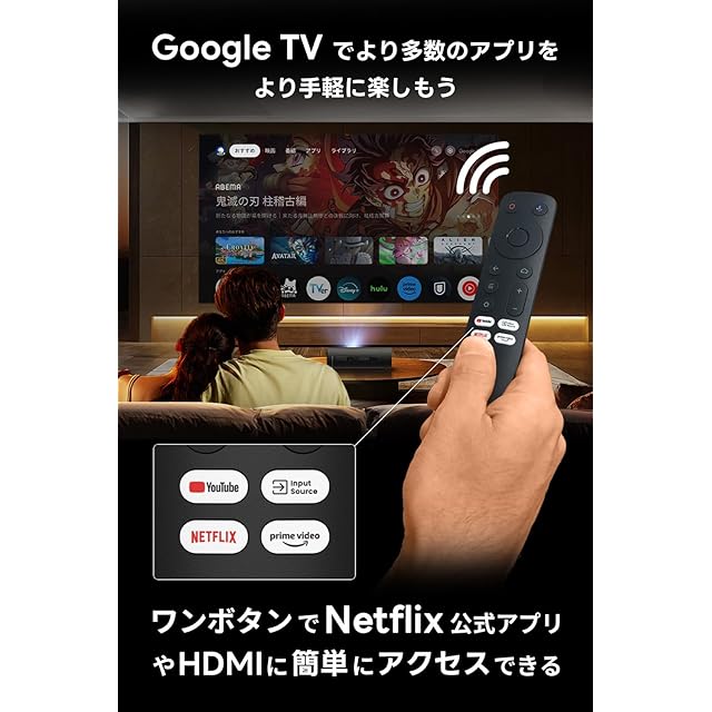 【Google TV搭載Netflix公式APP使用可】Google TV搭載したスマートプロジェクターなので、スマートフォンと同じ感覚でYouTubeやNetflix、Prime Vide、Hulu、Disney+、Abema TV、DAZNなど、さまざまなアプリを楽しむことができます。さらに、5W×2の高音質スピーカーも内蔵したオールインワンモデルなので、わざわざほかに機器を用意する必要がありません。