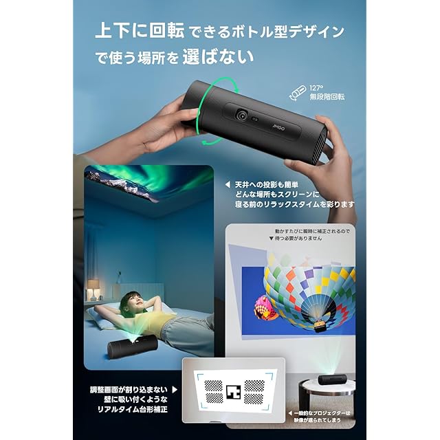 【回転できるボトル型デザイン&壁に張り付くシームレス補正】上下に127°回転することができるボトル型なので、角度調整のためにわざわざ下に物を敷いたり、別売りのスタンドを用意したりする必要がありません。さらに動かすたびに映像を遮らずにリアルタイムで歪みを補正するシームレスな台形補正・オートフォーカス機能を備えているので、パッと取り出してポンと置くだけで好きな場所に気軽に投影することができます。