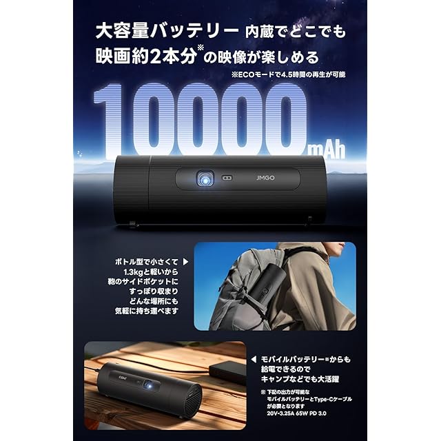 【大容量バッテリー内蔵でどこでも映像を楽しめる】10000mAhの大容量バッテリーを内蔵しているので、コード無しで最長4.5時間(※ECOモード時)と映画2本分の映像を楽しむことができます。コードレスで使用できるので、お子さんやペットが足を引っかけたり、お部屋の景観を乱したりすることがありません。