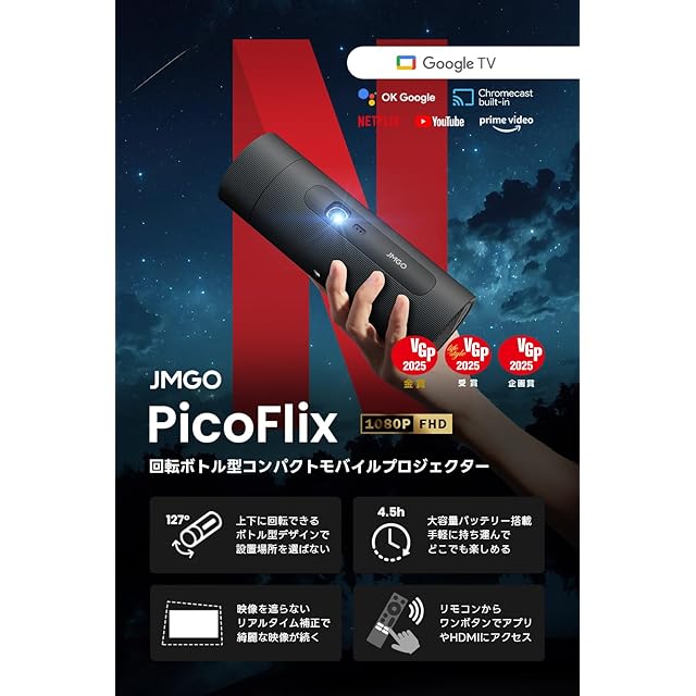 JMGO PicoFlix コンパクトモバイルプロジェクター【Google TV搭載/Netflix公式APP使用可/420ISOルーメン/回転できるボトル型/オートフォーカス/リアルタイム補正/全自動台形補正/モバイルバッテリー/小型 /10Wスピーカー/家庭用/低遅延/天井/静音】