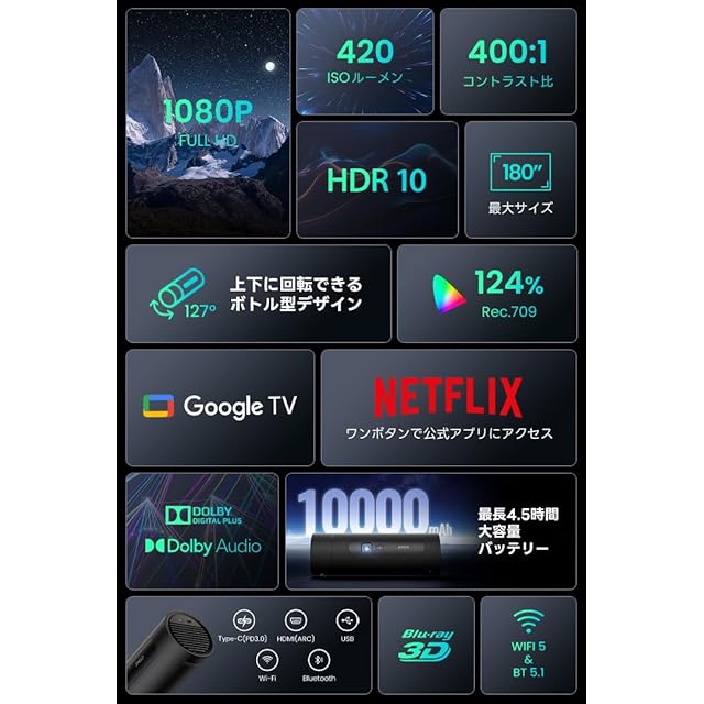 商品名:JMGO PicoFlix コンパクトモバイルプロジェクター【Google TV搭載/Netflix公式APP使用可/420ISOルーメン/回転できるボトル型/オートフォーカス/リアルタイム補正/全自動台形補正/モバイルバッテリー/小型 /10Wスピーカー/家庭用/低遅延/天井/静音】