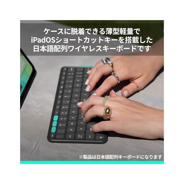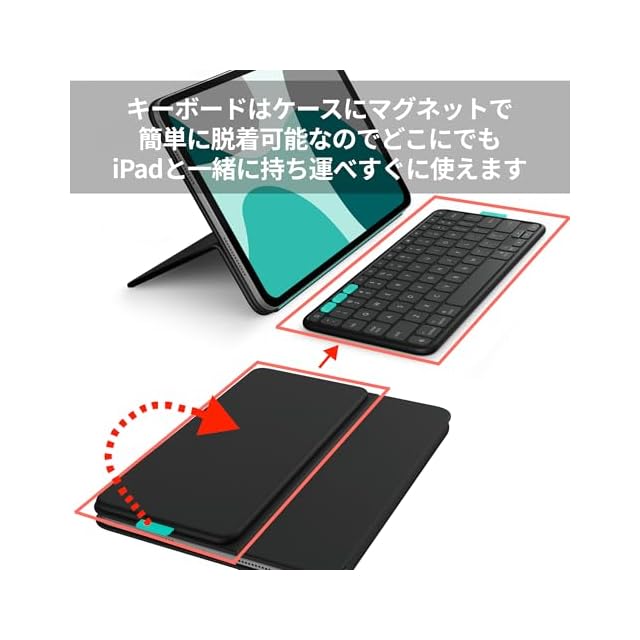 コンパクトで脱着可能なBluetooth ワイヤレスキーボード / ケースから取り外して好きな場所に配置してタイピングが可能、使わない時はケースにマグネットで簡単に収納できiPadと一緒に持ち運びできます。日本語配列キーとiPadOSショートカットキーを搭載しています。