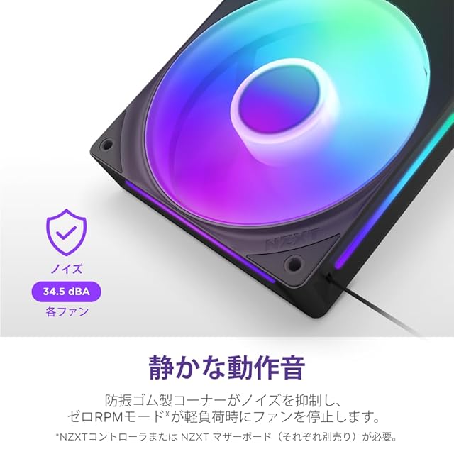 ファンごとに8個のRGB LEDが搭載されており、半透明のブレードを照らします。NZXT CAMを使用して、ライティングを個別にカスタマイズし、他のNZXT製品と同期させることができます。