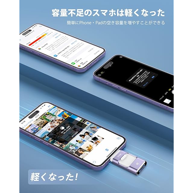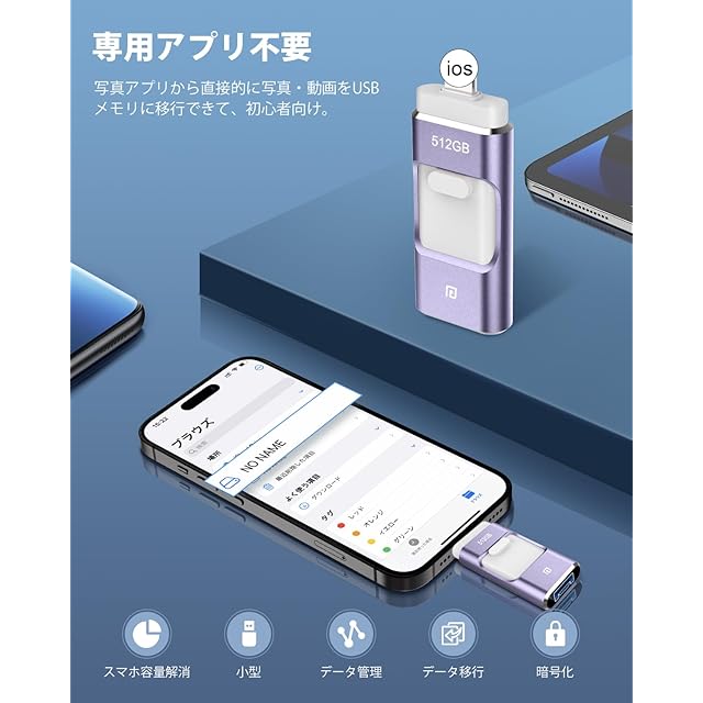 【アプリ不要、全面的にアップグレード!】専用アプリをダウンロードしないと使えない?最新技術でアップグレードされた新登場のiPhone対応USBメモリは、専用アプリをダウンロードせずにデータを移行できて、専用アプリから解0放します。USBメモリーをスマホに挿入するだけで、写真や動画などのデータをスマホのアルバムからUSBメモリに保存できて、スマホに付属している「ファイル」アプリではUSBメモリーに保存されているデータを確認できます。