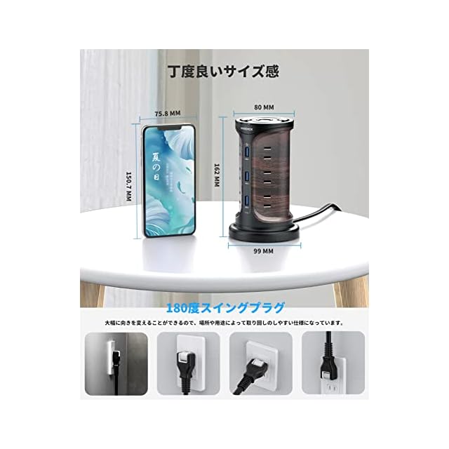 【180度スイングプラグ+2mの延長コード】この電源タップ タワーは180度スイング可能なコンセントプラグを採用していて、 狭い場所でも設置しやすいです。それに加えて、コードを被ふくと保護被ふくの二重被ふくで覆って、強度を向上させています。2ピン式コンセントプラグのピン根本に絶縁スリーブを装備しており、トラッキング現象による火災の防止に有効です。。2mのコードで、コンセントから距離があっても配線可能です。高級感のあるオシャレな外観で、家庭、オフィス、会議室、パーティーなどでも活用できます。