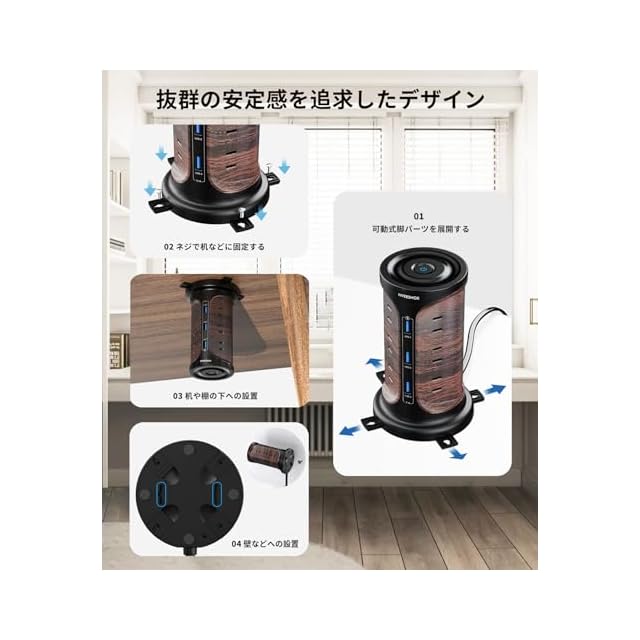 【安定性が抜群の固定パーツ付】このコンセントは独自の縦型タワー設計により、スペースをほとんど占有しません。底部に収納された脚パーツを搭載しており、脚パーツを引き出すことで、接続したアダプターなどで重量バランスが偏っていても、安定して設置することができます。因みに、脚パーツには穴が開いており、付属ネジを利用した仮固定などが可能です。本体底面にも仮固定用の穴を装備し、ネジ頭などに引っ掛けることで、壁などに設置できます。それに加えて、効率的な一括スイッチ(照光押しボタン)は、使用しない際に電子機器を完全に遮断することができます。