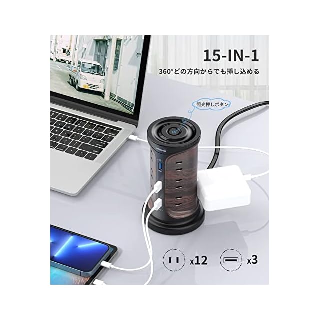 【1台15役の電源タップ】このタワー型電源タップは、4面にACコンセントを3個ずつ、1面にUSBポートが3個、合計15充電口配置されていて、スペースを最大限に活用することができます。USBポートを別に用意せずとも、ACもUSBも1台で接続対応できるので机の上がすっきりします。これは日本のために研究し、設計されている電源タップです(2ピン専用)。一般的なコンセント タップより小型でコンパクトです。AC電源最大1500Wまで対応。消費電力の高い家電も、家庭用コンセントと同様に使えます。