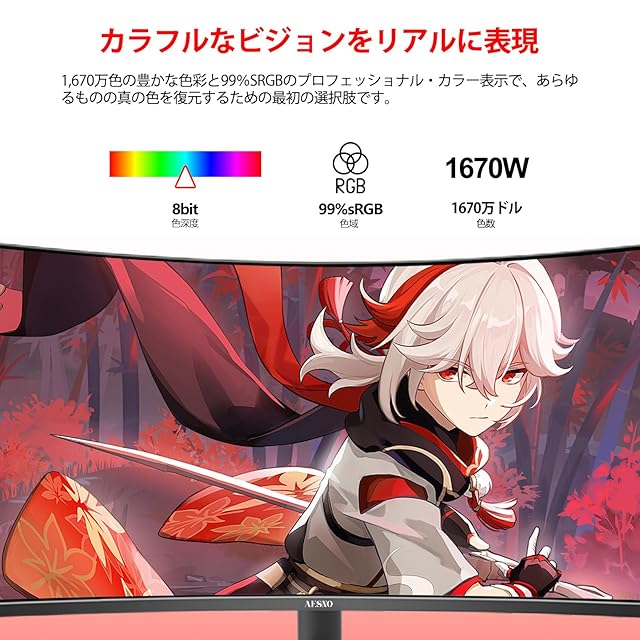 没入感のある超広視野角:AESNO 34 インチゲーミングモニターの 1500R 曲率 VA パネルは、21:9 UWQHD(3440×1440)の超幅スクリーンと 99% sRGB 色域を採用しています。これにより、従来のモニターを超える広色域表現が可能で、豊かでクリアな色彩階調と鮮明で輝くビジュアルを実現します。 ゲームの熱戦中でも、マルチタスク処理時でも、超広視野角による臨場感ある視覚体験を提供します。