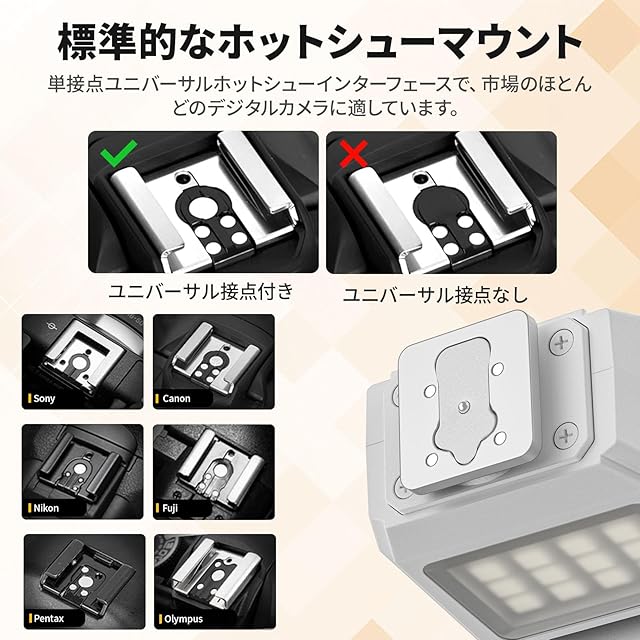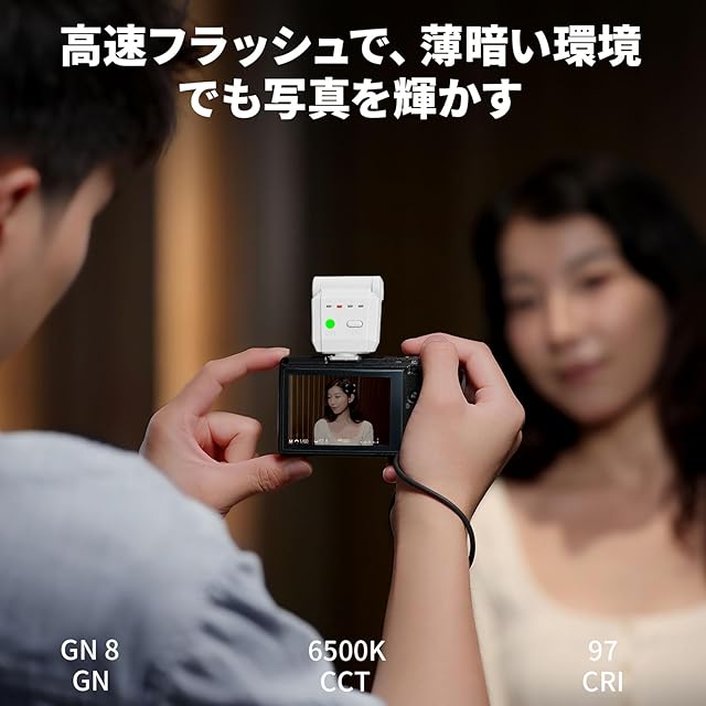 【ポケットサイズ】:6.8*4.3*2.3cm、わずか43gの重量で、従来の大型フラッシュとは異なり、ポケットに簡単に収まるか、カメラに取り付けることができ、どんな撮影条件でも持ち運びやすい完璧なアクセサリーです。※機器のショートを避けるため、フラッシュとカメラの電源を入れる前に機器を取り付けてください。