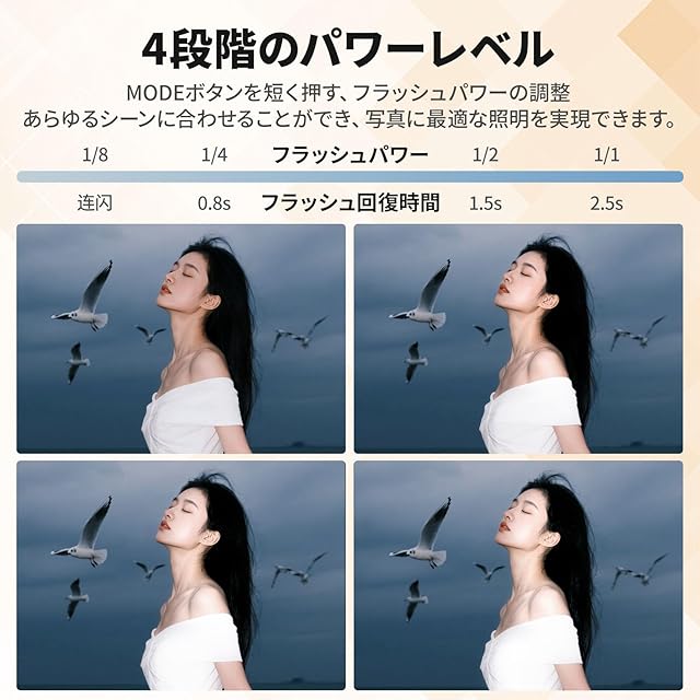 【信頼性よい】:暗い環境でも写真を輝かせるためのハイスピードフラッシュ。マニュアルフラッシュです。正しい出力設定を手動で設定する必要があり、TTLには対応していません。このスピードライトはGN 8(ISO100)、フラッシュの明るさ4 つのレベルから選択でき、CCT 6500Kを備えています。1/8パワーインスタント、連続フラッシュ撮影、素晴らしい瞬間を逃さない。 (*このスピードライトは4m以内での使用をお勧めします)フラッシュの明るさが低いほど、フルパワーに戻るまでのリサイクル時間が短くなります。ほとんどの内蔵フラッシュよりも明るく、自然な補助光を提供します。