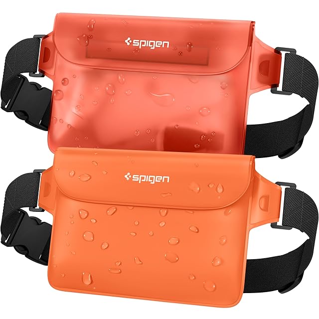 Spigen 完全防水 ウエストポーチ 2枚セット 小物 IPX8認証 海 プール 川 旅行 アウトドア スマホ収納可能 三重チャック ベルクロ PVC 大容量 防水バッグ A620 AMP06021 (サンセット・オレンジ)