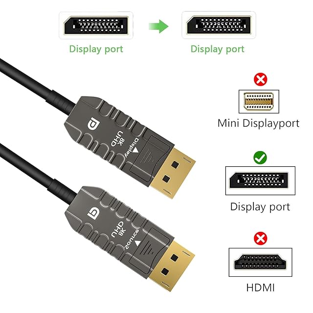 【ご注意ください】 光ファイバー Display port ケーブル「Active Optical Cable」は一方向伝送であり、正しい方向に取り付ける必要があります。オスの「ソースSource」プラグが付いたケーブルは、DP出力デバイス (Blu-ray プレーヤー、Xbox one、など); オス「ディスプレイdisplay」プラグ付きのケーブルは、DP ディスプレイ デバイス (テレビ、プロジェクター、モニターなど) の接続に使用されます。 この光 ディスプレイポートケーブルを 8K 機能で動作させたい場合は、デバイスが 8K をサポートしていることを確認してください。