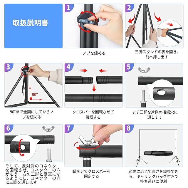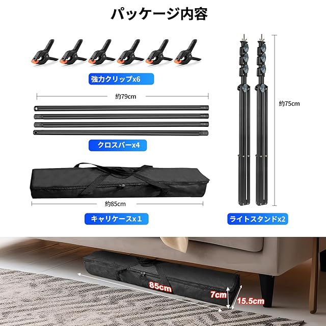 【パッケージ内容】4xクロスバー、2xスタンド、2xサンドバッグ、 6x背景布のクリップ、1xキャリーケース、1x日本語取り扱い説明書。