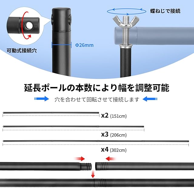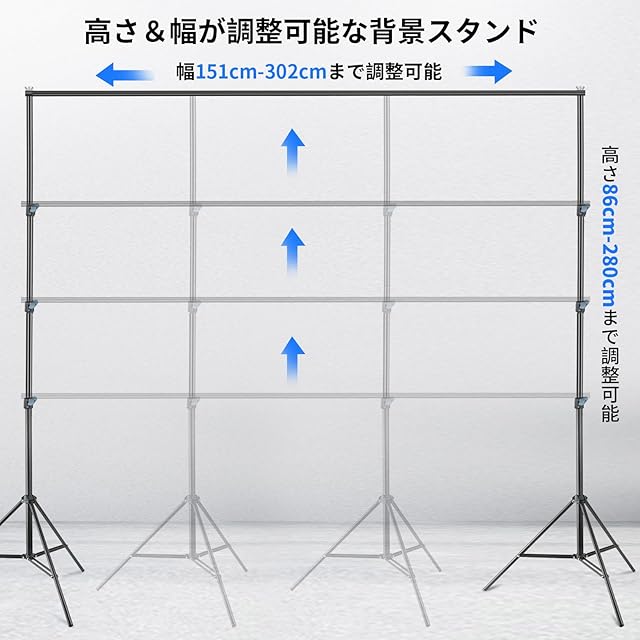 【調整可能、使用簡単】一人でも楽に組み立てや分解可能の背景撮影スタンドです。幅は151cm、226と302cmを調整可能、高さは約96cmから285まで自由に調整可能です。(ご注意:三脚スタンドの足を90°まで設置すると安定性が一番良いです。)