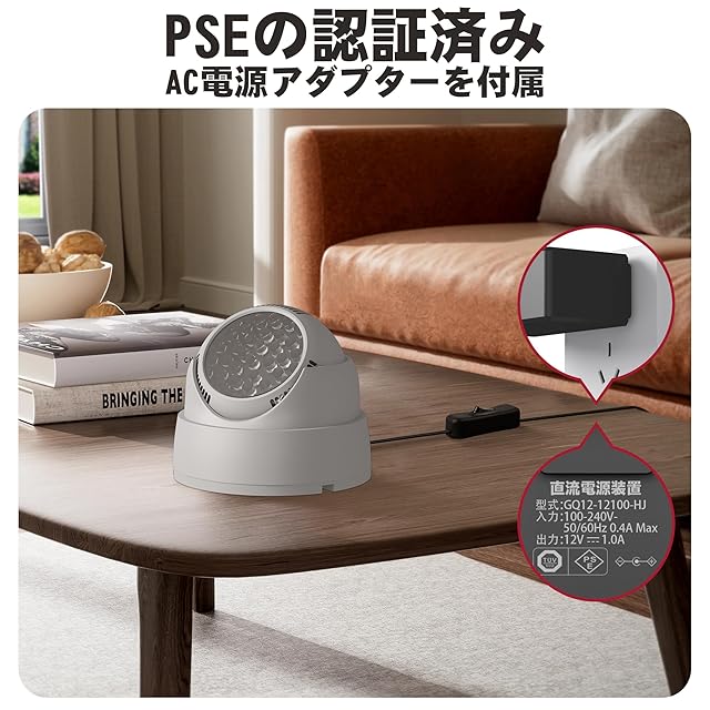 【PSE検証済みACアダプター付き】赤外線ライトと共に使用されます。出力:DC12V 1A 最大出力12W。アダプターの寿命を左右する電解コンデンサーに高信頼品です。過圧保護、過熱保護、過流保護、回路短絡保護などを搭載します。