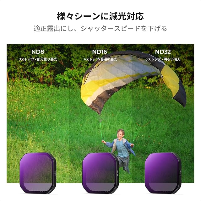 【多機能フィルターセット】PLフィルターとND8、ND16、ND32の減光フィルターがセットになっており、偏光効果と減光効果を同時に得られます。多様な撮影シーンに対応可能です。