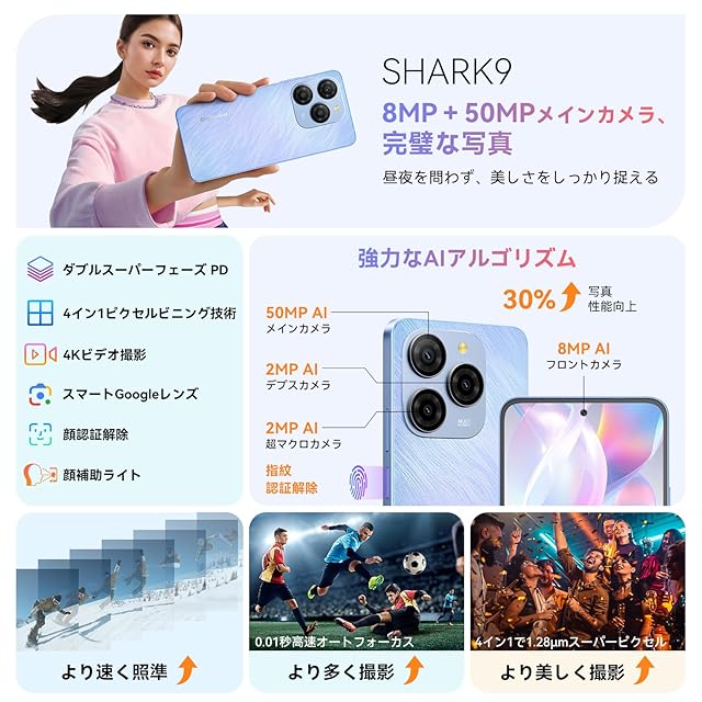 【50MP AIカメラシステムで、日常のすべての瞬間をキャッチ】 50MPメインカメラは複数レンズのAIシステムを搭載し、夜景、人像、HDRなど多彩な撮影モードに対応。さまざまな光環境でも高精細な写真や動画を簡単に撮影できます。日常のセルフィーや旅行での壮大なショットまで、Shark9がすべての素晴らしい瞬間を鮮やかに捉えます。