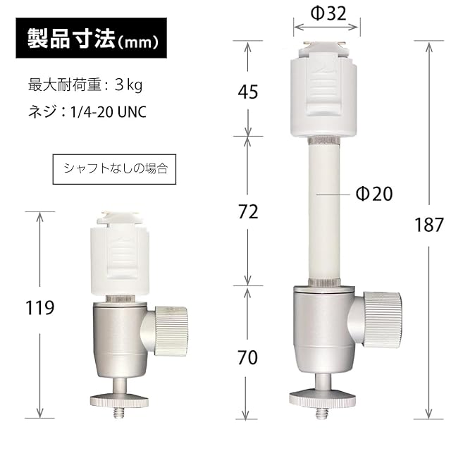 【寸法】約187mm×32Φ(ネジ部品30Φ、シャフト20φ)【重量】約273g 【耐荷重】3kg以下 【1年付】
