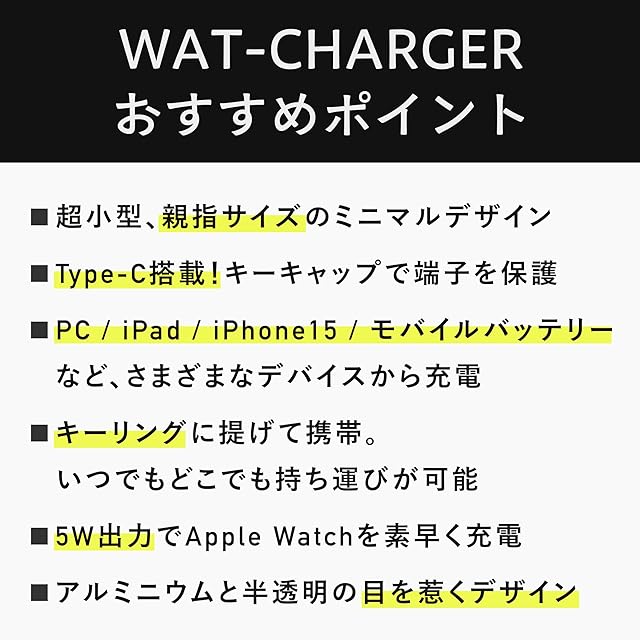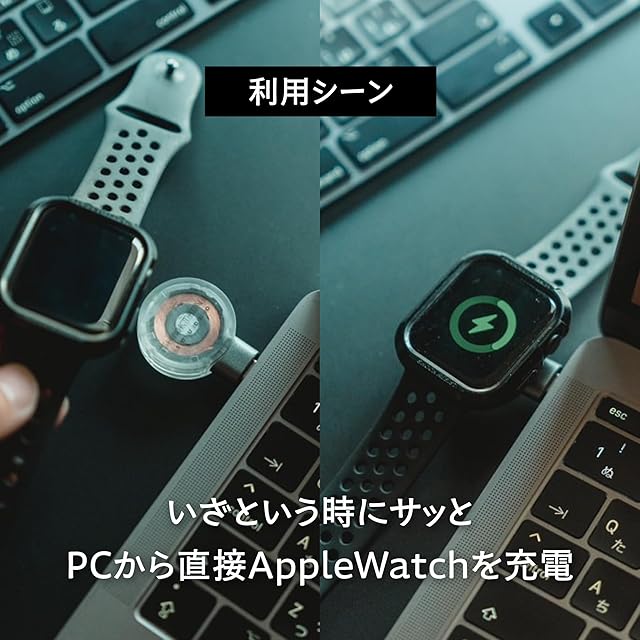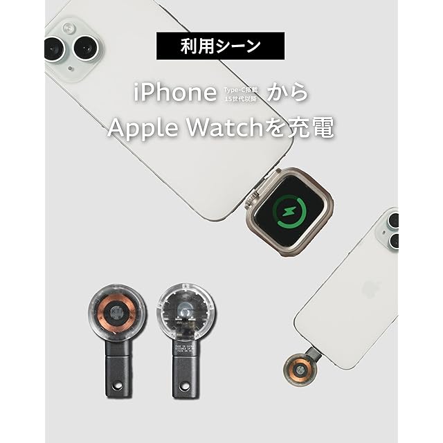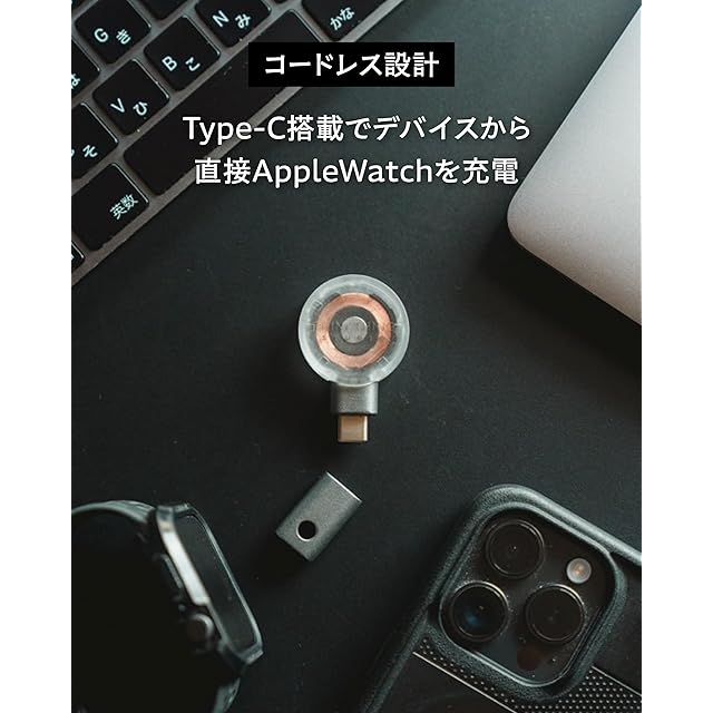 Apple Watch向けの超小型充電器。端子を保護するキャップにリング穴を用意し、カラビナ等で自在に持ち歩けるスグレもの。USB Type-Cポートに挿して、お手持ちのApple WatchやAirPods4/AirPods Pro2など、対応デバイスを充電できるコンパクトでポータブルな充電器です。