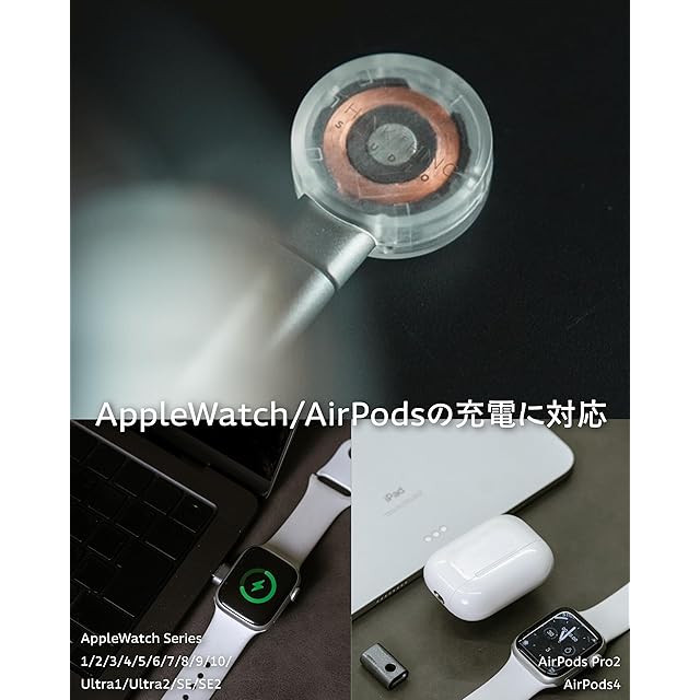 AppleWatch充電に対応のApple Watch Series 1-9 / Ultra 1, 2 / SE 1-3 / AirPods4 / AirPods Pro2を充電可能