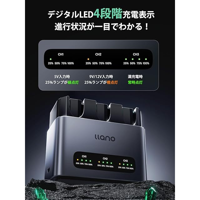 【4段階LEDインジケーターで残量確認】本体のLEDディスプレイでバッテリー残量を一目で把握可能(25%・50%・75%・100%の4段階表示)。カメラにバッテリーを装着せずに残量確認でき、撮影前の準備がスムーズに。