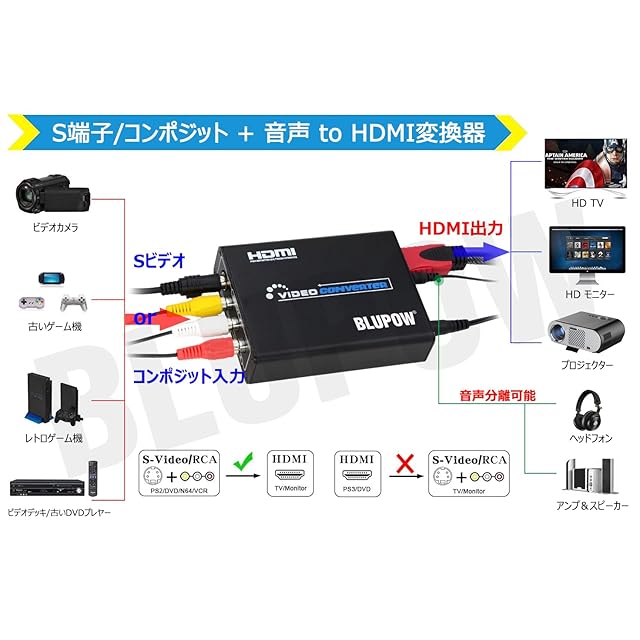 BLUPOW コンポジット/S端子 to HDMI 変換器 1080P対応 Composite 3RCA AV/S-Video to HDコンバーター Sビデオ/3色端子をhdmiに変換 アナログ デジタル 変換機 rca to hdmi レトロゲーム機(セガサターン/SFC/N64/PS2など)向けの変換器 日本語マニュアル付き VA504 | TREND DESIGN 家電専門店