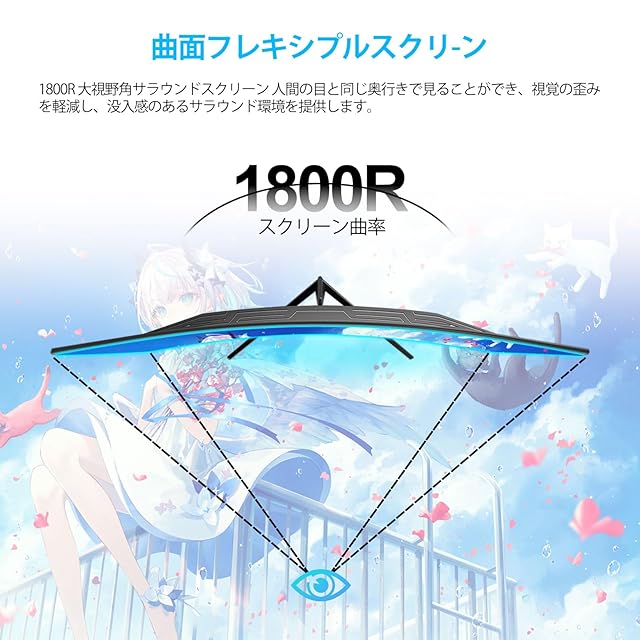 没入感を高める湾曲デザイン:32 インチの 1800R 大型湾曲サラウンドスクリーンで、大きな視野角が心地よく、人間の目の視野角と同じ奥行きを見ることができ、視覚の歪みを軽減します。