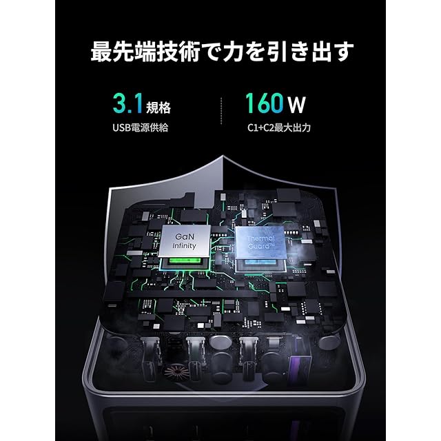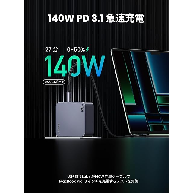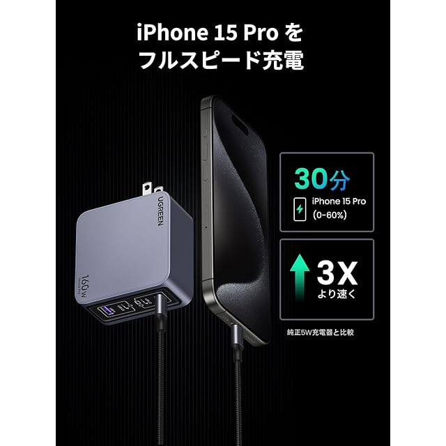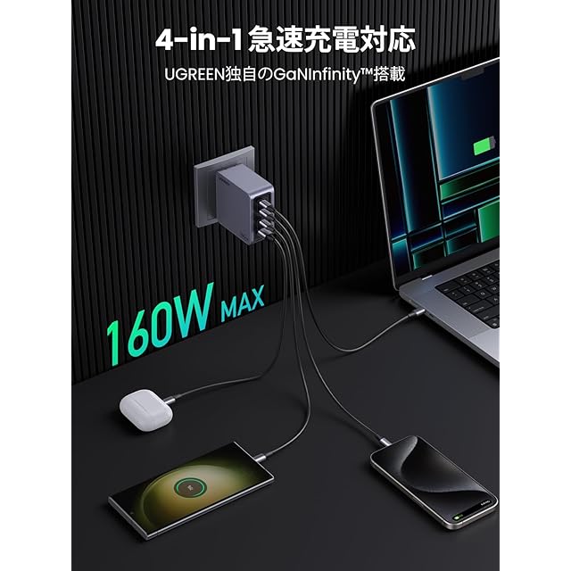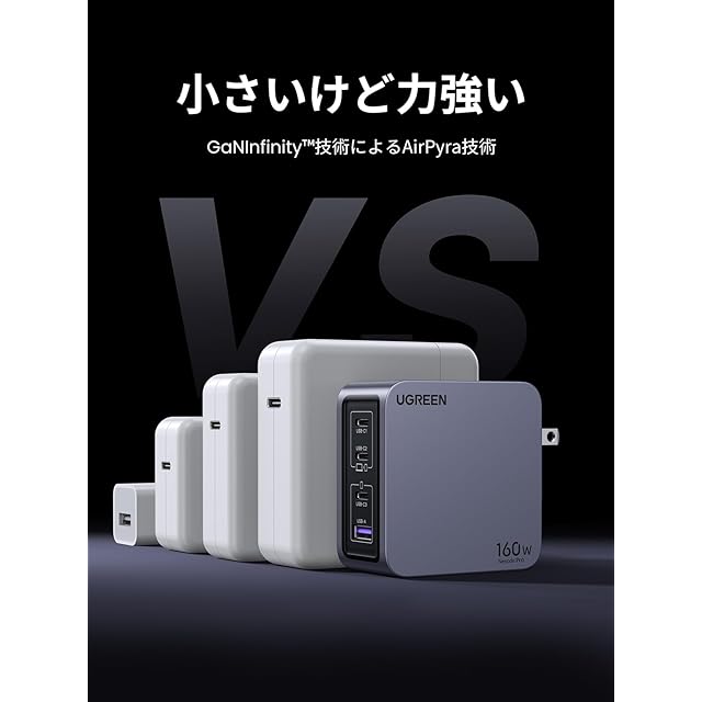 商品名:UGREEN Nexode Pro 充電器 160W 3ポート 単ポート140W 【新生代GaNInfinity™チップ+UGREEN独自Airpyra技術】PD急速充電器 USB-C*2とUSB-A*1 PD3.0/QC4+対応 折畳み式プラグ ノートPC/iPad/iPhone16/Galaxy S24/Pixel8/XPeria5以降対応 galaxy超急速充電45W対応 PSE技術基準適合