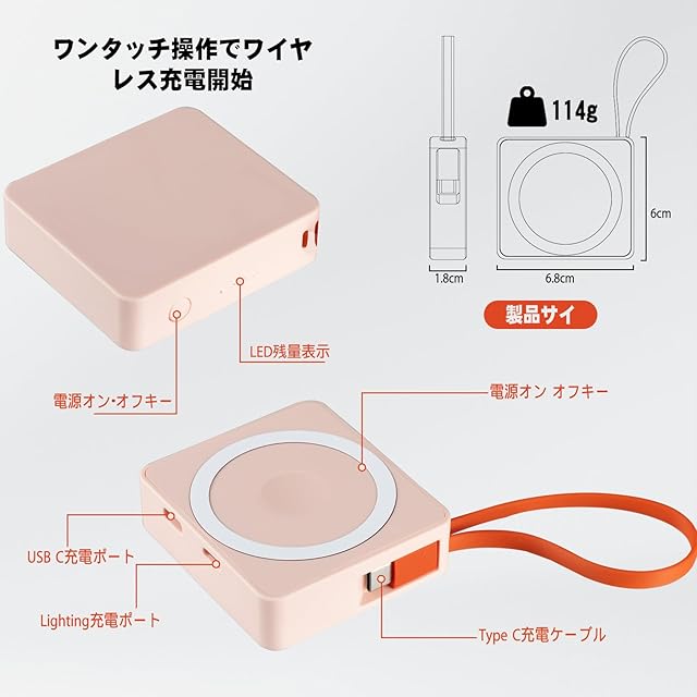 【超薄型・軽量ボディで持ち運び簡単】高出力・高性能ながらポータブルでシンプルなデザイン。 モバイルバッテリーは5000mAh容量のバッテリーを搭載していても約縦6.8cm×幅6cm×厚さ3cmの超薄型コンパクトサイズで、ポケットに収まり、片手で簡単に掴むことのできるスリムさを実現できました。 重さもたったの112gとスマホ1台分程度とかなり軽量で、ポーチやカバンに入れて持ち歩いても邪魔にならず、旅行や充電環境のないアウトドアシーンに持ち出すことも楽しくなります。 Type C充電ケーブルはストラップ付きデザインなので、簡単に手に持ったり、リュックサックなどの留め金が付いた物に掛けたりすることができます。