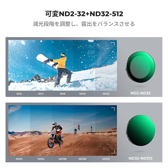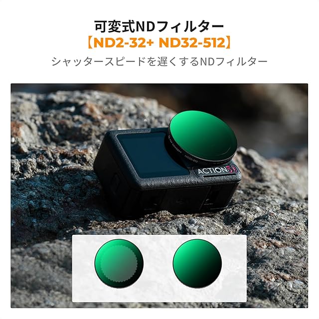 【Osmo Action 5Pro/4/3専用可変NDフィルターセット】ND2-32とND32-512の2つのフィルターを含むこのキットは、さまざまな光量条件に対応。明るい日差しの中でも、適切な露出を確保し、動きのあるシーンでも滑らかな映像を実現します。