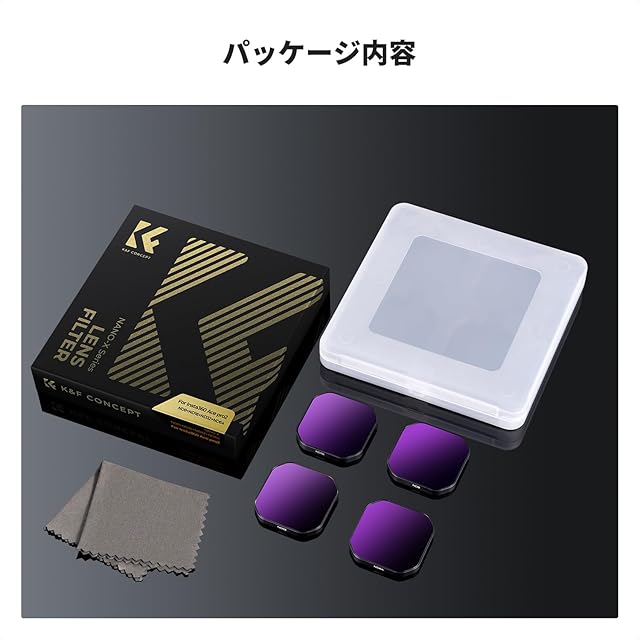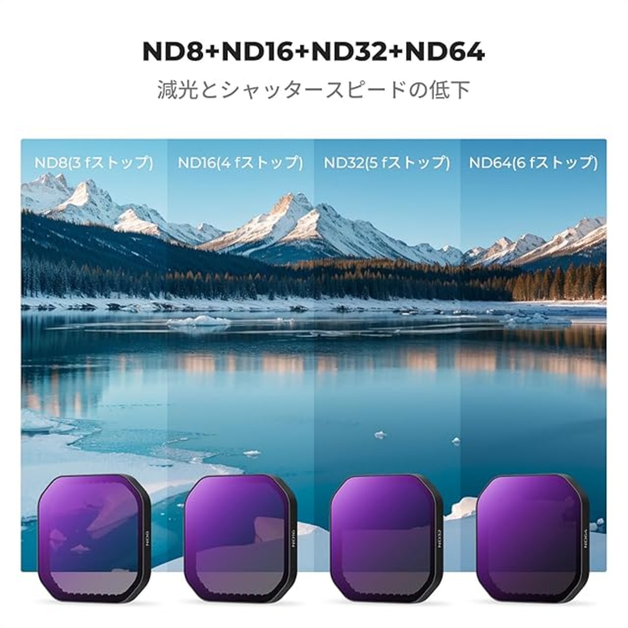【多様な減光効果】ND8、ND16、ND32、ND64の4種類のフィルターが含まれており、様々な撮影条件に応じて減光量を調整できます。動きのある被写体や明るい環境でもスムーズな映像を実現します。