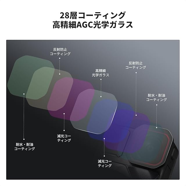 【28層ナノコーティング・高透過率】フィルター表面は28層のナノコーティング処理が施されており、優れた撥水性と防汚性を持ち、様々な撮影環境に対応します。さらにAGC光学ガラスを使用し、高い透過率を実現。画像品質を最大限に保ち、鮮明でシャープな画面効果を提供します。