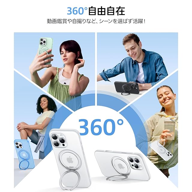 【360°回転・使用体験更なる高みへ】卓越した360°リングデザインで、従来の限界を打ち破り、iPhone 16eの使い心地を高めます。2025 年更新されたこの内蔵スタンドは、カチカチとした音が回転ごとに小さな達成感をもたらし、回転がストレス解消につながります。また、好みの角度にしっかり固定できるため、動画鑑賞時の快適さが大幅に向上します。動画鑑賞する際に、夢のような映像を楽しみながら、自宅に別の世界を創り出します。さらに、360リングスタンドがあれば、片手操作がスムーズになり、好きな場所に設置して自動撮影にも活用できます。外出先でのトキメキ瞬間を捉えるのにも便利で、出会ったあらゆる美しい瞬間を簡単に記録できます。