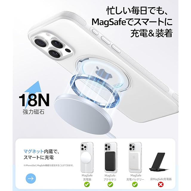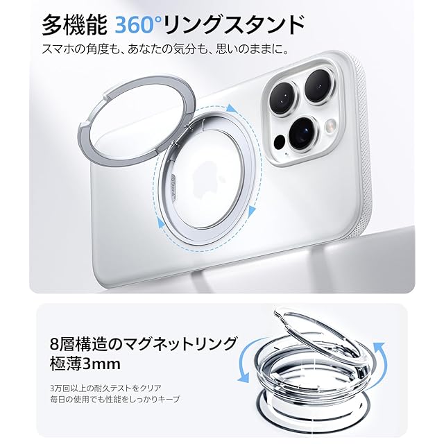 商品名:TORRAS iPhone 16 Pro 用 ケース【カチカチ・多機能360度回転スタンド】カメラコントロールボタン付き 縦横両対応 マグネット搭載 MagSafe対応 米軍MIL規格耐衝撃 リング 指紋防止 黄変防止 マグセーフ対応 レンズ保護 滑り止めドット模様 手持ち撮影 安定性 三眼 いphone 16 pro 用 ケース 6.3インチ「Ostand R Fitness」(純白)