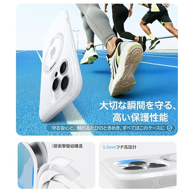【エアバッグ搭載・強耐衝撃】 内側には縞状RUNWAYエアバッグが搭載、優れた保護性を発揮!ランウェイをイメージしたエアクッションで iPhone 16eを包み込みます。高さ1.5mmのベゼルが、スケート中や山道での転倒時にも、画面とレンズをしっかりと保護。さらに、四隅の強化構造が衝撃を効果的に吸収します。ジムの床から砂利道まで 4000 回以上の落下テストをクリアし、高品質の保護素材により耐久性が実現されています。(iPhone 16e 専用)