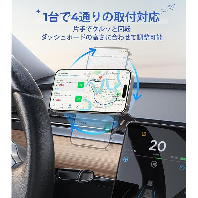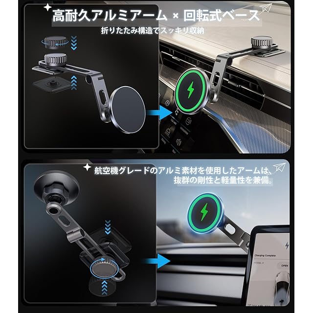 【自由変形 × 折りたたみ構造|片手操作でスマート収納】 ダッシュボード派?それともテスラのセンタースクリーン派?この車載ホルダーは、2方向に折りたためる革新的なアーム設計を採用し、使わないときはワンタッチで折り畳み可能。片手で簡単に開閉できるから、操作ストレスゼロ。車内空間を圧迫せず、視界スッキリ。Tesla Model 3/Yにも自然に溶け込む設計で、まるで純正アクセサリーのようなフィット感。高さ・角度も自在に調整でき、自分仕様のジャストポジションに最適化。