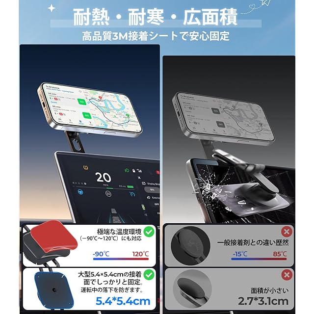 【高耐熱3M粘着ベース|真夏のダッシュボードでも剥がれない】 業界最高クラスの3M GPH-160高耐熱粘着シートを採用。-20℃〜125℃の温度変化にも耐え、真夏の車内(最大70℃超)でも剥がれずしっかり固定。初回設置時に10秒強く押し込むことで、最大の粘着力を発揮。革・布・凹凸面以外ならダッシュボード・ディスプレイ周りなど幅広く対応。MagSafe 車載ホルダーとしての固定力が格段にアップ。