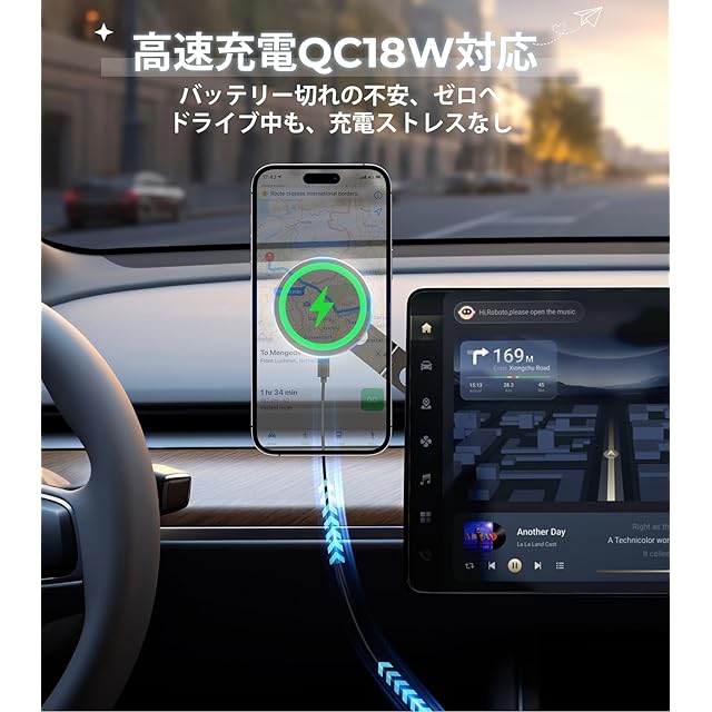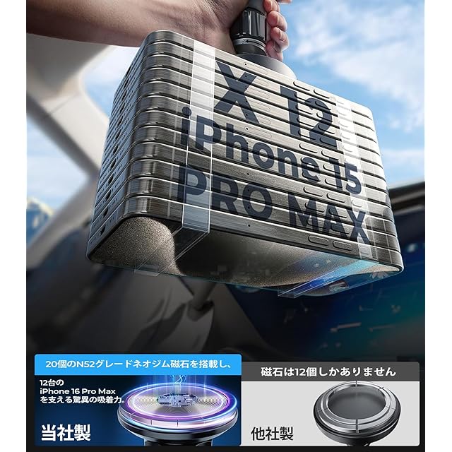 【20個N52磁石でガッチリ固定|段差も揺れず安定】 本製品は、業界最高クラスのN52グレードネオジム磁石を20個搭載。 iPhone 15 Pro Maxなどの大型スマホも、最大15Nの吸着力でピタッと固定。 急ブレーキやカーブ、高速道路の走行中でもスマホがズレる心配ゼロ。 片手でのワンタッチ装着・着脱が可能なため、運転中のストレスを軽減し、スムーズな操作が可能。MagSafe車載ホルダーを選ぶなら、吸着力が命です。