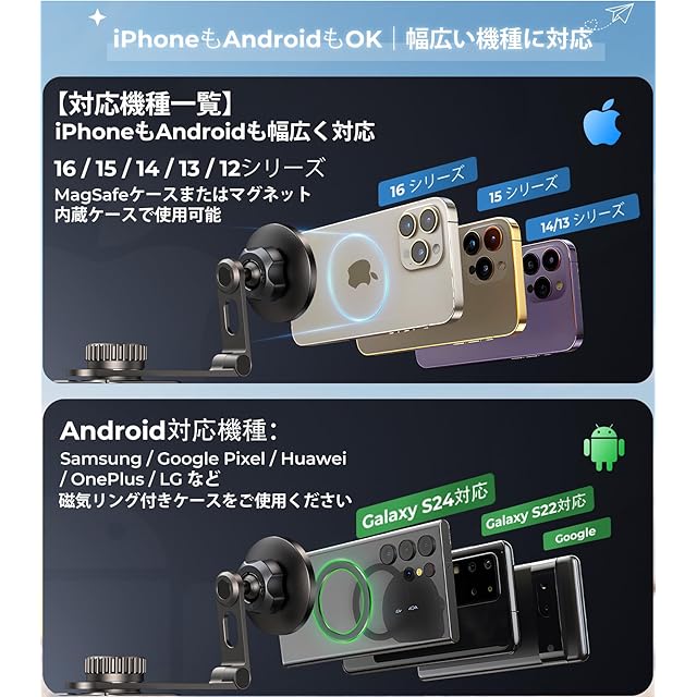 【MagSafe全シリーズ対応|家族で使えるマグネット式スタンド】iPhone 12〜16シリーズおよびMagSafeケースに対応し、ワンタッチでピタッと固定&安定充電。さらにGalaxy S26シリーズなら、ワイヤレス充電も対応可能。 Pixel・Xperiaなどその他Android機種は、付属の金属リングを装着すればマグネットでの固定が可能ですが、充電機能は非対応です。マグネット式スマホスタンドとして、車内のスマホ固定ニーズを1台でスマートに解決。