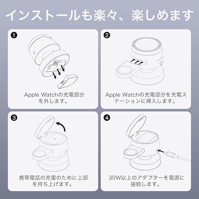高速ワイヤレス充電スタンド: iPhoneは15W、Apple Watchは2.5W、AirPodsは3Wの高速充電が可能。各デバイスは独立して充電され、他のデバイスの性能に影響を与えません。これにより、1つの高速統合充電ソリューションの利便性を享受することができます[注:フルスピードで充電するには、30W以上のPD充電器を使用してください]