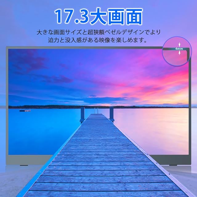 【17.3インチ大画面・ベゼルレスデザイン】効率的な在宅作業のために、サイズがより大きな17.3インチのモバイルモニターを開発されました。従来の15.6インチのモニターより、画面表示範囲は10%以上拡大しましたので、作業効率がどんどん上がります。モニターの上と左右のベゼルはわずかの4mm、本体がスリムなサイズを持ちながら、最大表示領域も保有するスマートなデザイン。画面占有率は実に約95%とほぼフレームレスを実現している。モバイルモニターが小さすぎてお悩みなら、UPERFECTの17.3インチ 4K高画質のモバイルモニターをお勧めいたします。