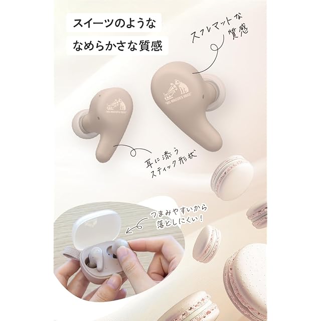 ✅スフレマットな質感と左右非対称カーブデザイン___イヤホン本体は耳へのフィット感と、着脱するとき指でつまみやすさを両立するデザイン。スイーツのような質感がユニークです。