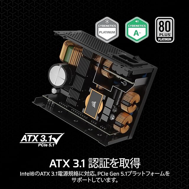 ATX 3.0とPCIe 5.0に対応。12VHPWRケーブルが付属しており、消費電力の多いグラフィックボードも利用可能です。
