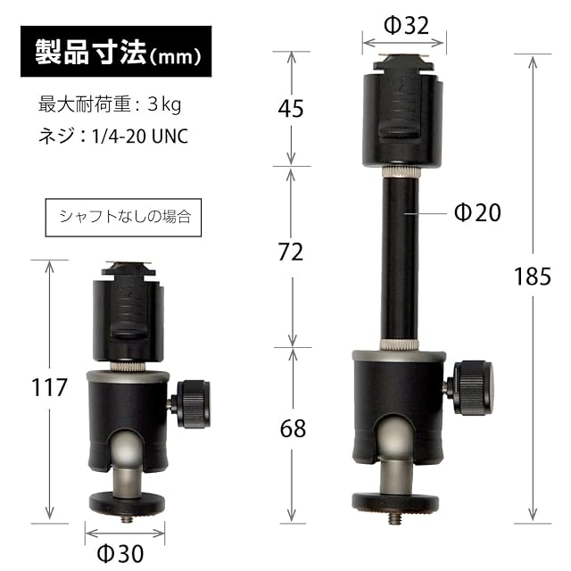 【寸法】185mm×32Φ(ネジ部品30Φ、シャフト20φ)【重量】約260g 【耐荷重】3kg以下 【1年付】