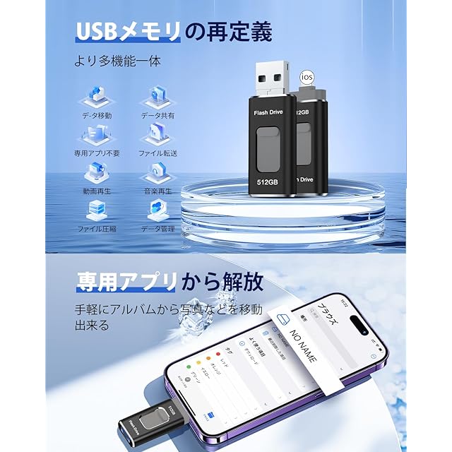【従来品への飛躍!専用アプリ不要・多機能実現】最新技術で開発したUSBメモリでアプリなど面倒な設定は一切無し、iOS システムに付属のファイル アプリを使用して、挿せば直ぐに使用可能。写真、動画、音楽はもちろん、ExcelやPDFなどの書類データも転送可能、機器の操作が苦手な方でも簡単にデータ移動ができます。スタイリッシュなデザインに加え、便利な機能が満載のスマホ USBメモリーは、スマホと接続すると、音楽再生・写真バックアップ、ファイル圧縮・解凍、動画/画像/資料編集などの機能を果たすことができます。仕事を効率化して、日常生活をより便利にしてくれます。