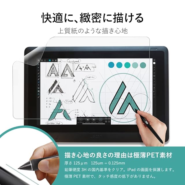 【対応機種】: Wacom Cintiq Pro 24 (DTK-2420/DTH2420) 用 【ケント紙のような書き心地を忠実に再現】:本フィルムとタッチペンを使うとケント紙に鉛筆で書いている様な書き心地です。紙の抵抗感と摩擦係数をフィルムで実現しました。 【ペン先摩耗低減】:一般的なペーパータイプ フィルムに比べ、ペン先の摩耗を50%低減することができます。※抵抗感は多少低下します。 【耐久性】:耐擦傷性試験にて、500gのスタイラスペンで5000回の筆記試験を行っても品質の劣化は認められませんでした。 【反射低減】:フィルムは光の反射を抑えるアンチグレア(ノングレア)の特性があります。※透明感を求めるユーザーには向きません。 【気泡ゼロ】:特殊なシリコン吸着素材を採用。指やカードで簡単に押し出すことができます。貼り付け失敗した場合でも、はがして貼り直しが可能です。※ホコリが立ちにくい場所で拭き取りシート、クロス、ホコリ除去シールを使用し、ホコリを完全に除去してから貼り付けてください。 【フィルム貼り初心者様歓迎】: フィルムを綺麗に貼れるよう『充実の付属品』でサポートいたします。