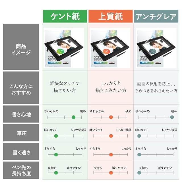 【対応機種】: Wacom Cintiq Pro 24 (DTK-2420/DTH2420) 用 【ケント紙のような書き心地を忠実に再現】:本フィルムとタッチペンを使うとケント紙に鉛筆で書いている様な書き心地です。紙の抵抗感と摩擦係数をフィルムで実現しました。 【ペン先摩耗低減】:一般的なペーパータイプ フィルムに比べ、ペン先の摩耗を50%低減することができます。※抵抗感は多少低下します。