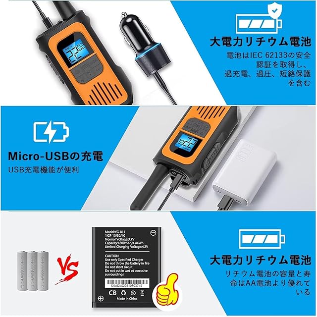 実用的な機能: これトランシーバーセットはVOXハンドフリー機能付き、LED懐中電灯内蔵、耐久性、クリスタルサウンド、自動省電力、ローバッテリーアラーム、オートスキャンチャンネル. 同じチャンネルに設定すると、複数人での通話が可能です、 USB充電機能コスト、環境保護を節約、でき充電機器を見つけるのは簡単です。